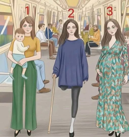 Et simpelt spørgsmål, der kan dele meninger: Når du sidder i metroen og ser en, der har mere brug for sædet end dig, hvem skal så få det? Billedet viser tre kvinder – en med et lille barn, en med en stok og en, der er gravid. Alle har gode grunde til at have brug for sædet. Men hvem ville du vælge? 🤔