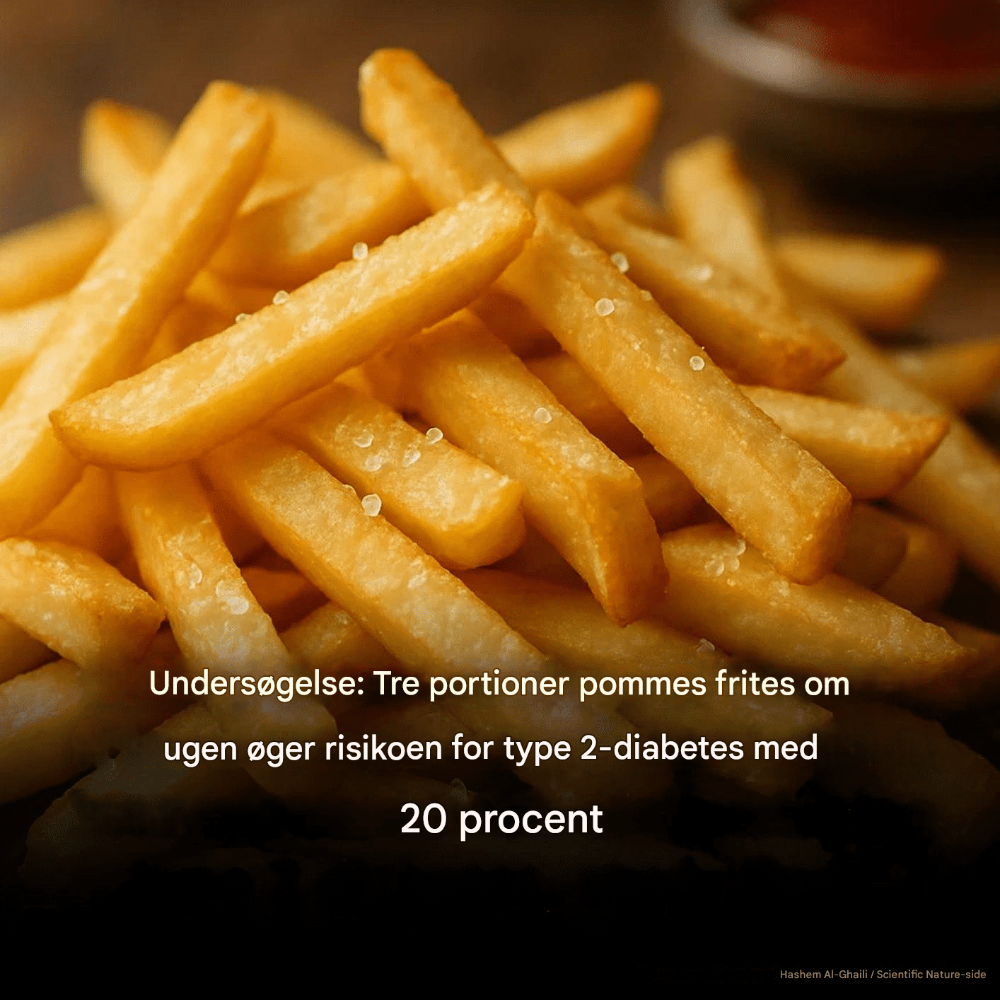 Tre portioner pommes frites om ugen øger risikoen for type 2-diabetes med 20%, mens det at spise lignende mængder kartofler tilberedt på forskellige måder – kogt, bagt eller most – ikke øger risikoen signifikant.